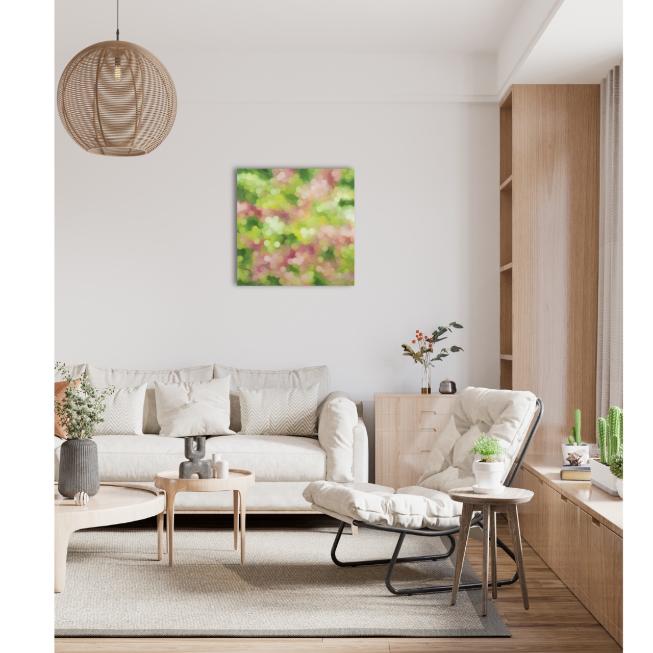 Painted on a 2 cm deep canvas; the sides are continuous, allowing display without a frame.